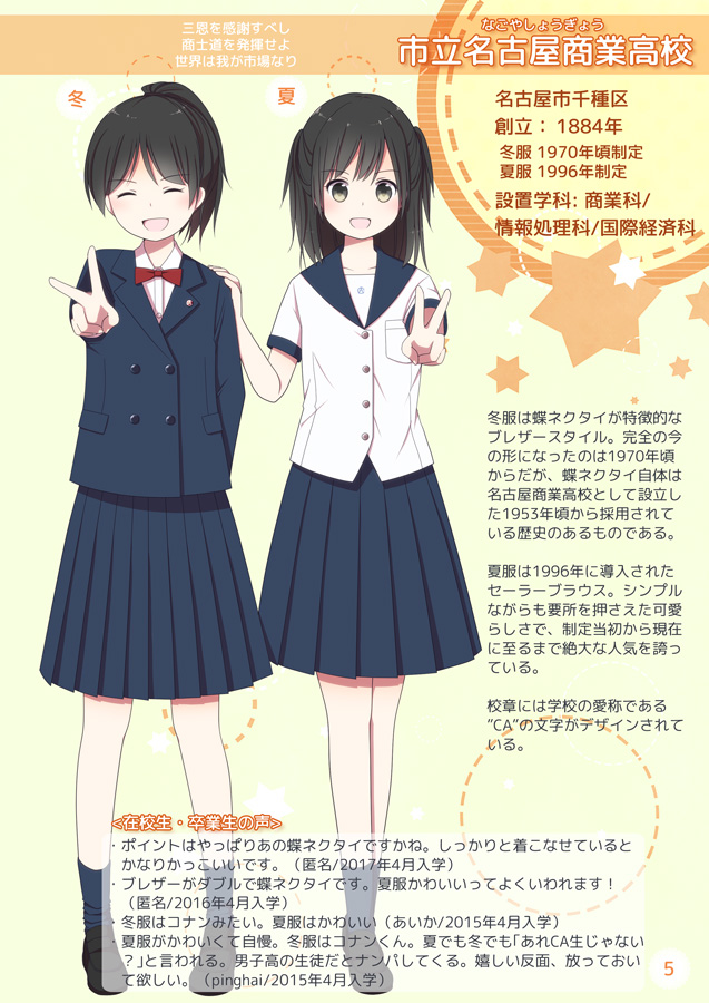 2017/12/14 Category : 制服 冬コミ(C93)新刊について 毎回「お久しぶりです」から始まるブログで申し訳ありませんが、今回もお久しぶりです。 C93冬コミ、無事当選しておりました。 3日目(12月31日)日曜日 東4ホール ラ-53a 初恋プチフレア です。 初めての誕生日席となります。 新刊情報です。 「愛知県JK制服目録 -名古屋東部 公立編-」 B5サイズ/フルカラー24P/頒布価格500円(書店価格600円+税) 前回(西部編)の続編となっておりますので、前回とだいたい同じ構成です。 文教地区を含むエリアのため、名の知れた高校が多く収録されています。 旭丘、明和、菊里、千種などなど…。 ページが余ったので、おまけで旧制服なども少し描きました。 今回は少し時間に余裕があったので、新規イラストの描き下ろしが多いです。夏服はほぼ描き下ろせました! 冬服はいつも通り、既存イラストのリメイクが大半ですが…。 会場限定ノベルティでポストカードもご用意したので、当日ご都合の良い方は是非お越しください。 会場に来られない方向けに、メロンブックス様での委託販売でも特典をご用意しております。 こちらはミニ色紙です。先着順となりますのでお早めにご注文ください。 あとは、特典は付きませんが、とらのあな様・BOOTH(準備中)でも委託販売しますので、ご都合の良い窓口をご利用ください。 年明けには各書店店頭でも販売されます。 お品書きや、当日についてなどは、また改めてご案内します! PR Comment0 Comment Comment Form お名前name タイトルtitle メールアドレスmail address URLurl コメントcomment パスワードpassword