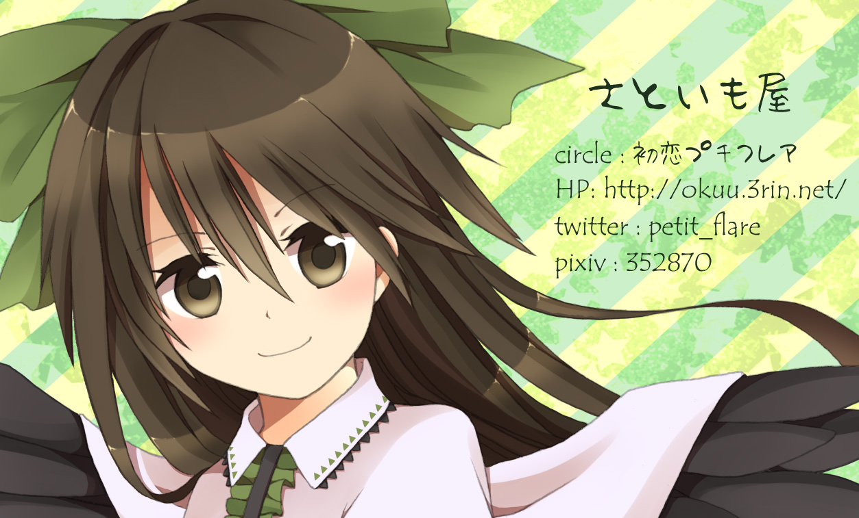 2013/10/06 Category : 東方 紅楼夢9頒布物 おしながき こんにちは。紅楼夢まであと1週間ですね。 余談ですが紅楼夢の前日がポケモンXYの発売日なので当日のすれちがい通信が地味に楽しみです。 「さといも」って名前でプレイする予定なのですれ違った皆さんよろしくお願いします。 さて、頒布物のおしながきです。 ・新刊「スキの反対。」B5/26P/400円 ・既刊「だいすきで たいせつで。」A5/16P/100円 ・A4クリアファイル 200円 ・ポストカード 無料配布 あと東方じゃないのでおおっぴらには出しづらいのですが、 電子書籍「全国JK制服着こなし・萌えポイント解説」の試し読み用冊子を持っていきます。 ※1冊しかないので頒布・販売はしません。 電子書籍の試し読みを紙の本で…というのもおかしな話ですけどね。試し読みで気に入ってくださった方はKindleまたはiBooksよりお求めください。 それと配布用の名刺も作りたかったのですが、10枚作ったところで飽きてしまいました。よって名刺は10枚しか持っていきません。途中でなくなったらごめんなさい。 当日はこの名刺を首から提げていますのでお気軽に声をかけてくださいね。 5号館 か-27a 初恋プチフレアでお待ちしてます!