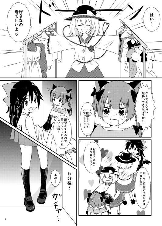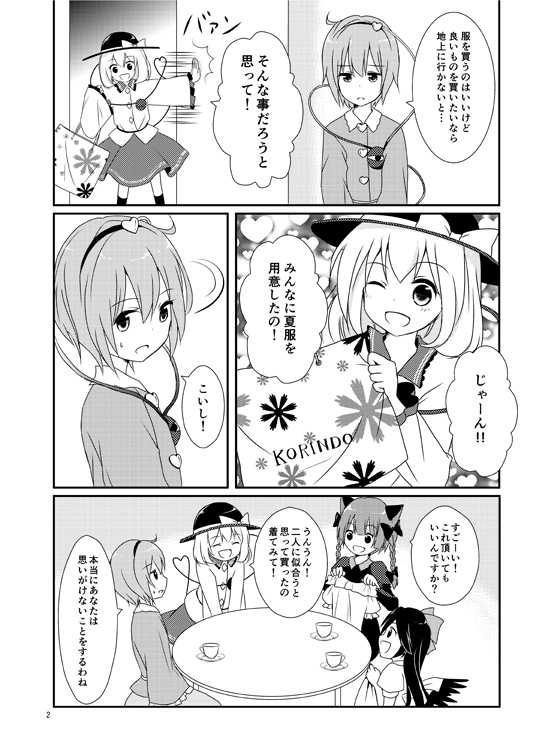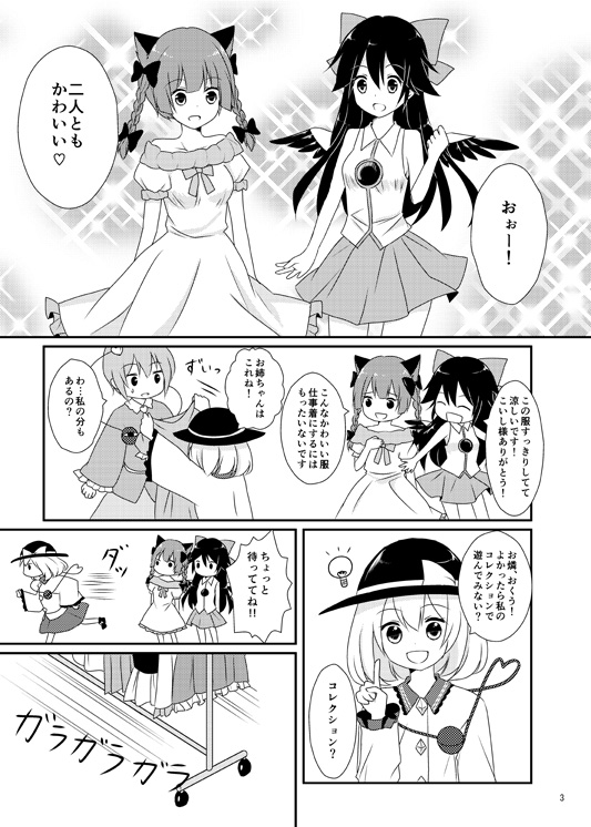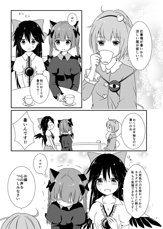 2014/05/02 Category : 東方 例大祭11新刊のお知らせ 例大祭新刊、無事入稿できました~。 「地霊殿コスプレサミット」B5/24P ↓本文サンプル↓(クリックで大きくなります) 古明地姉妹がおりんくうにコスプレさせて楽しむ、ほのぼの漫画です。 コスプレメイン本と見せかけて、実はおりんくうの○○がメインの話です。(読んでからのお楽しみ!) 今回かなり急いで作業したのでちょっと画面が寂しいところがあるかもしれません。 次からはもっと早めに取り掛かろう…。 色々なおりんくうが描けてとても楽しかったです。 古明地姉妹も初めて描けたしね! 例大祭当日来られない方はとらのあな様の通販でご購入ください。 通販ページはこちら(販売開始前でも予約できます) 例大祭のスペースは東5ホール ち-13bです。 また直前にでもお品書きアップします! PR